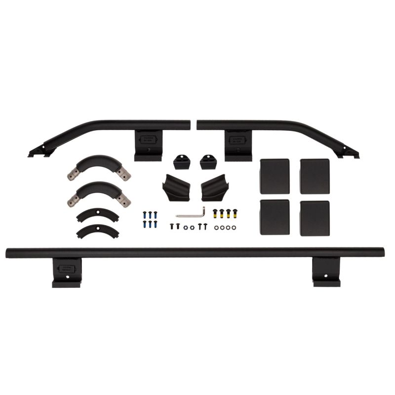 The quarter guard rail attaches quickly and easily to the dovetail extrusion around the BASE Rack's perimeter with some additional fixing points at the rack corners. Quarter Rails allow for ample storage and load security at the front of the rack.