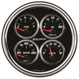 Sometimes Space Is Limited. The Autometer Quad Gauge Provides A Solution To Limited Dashboard Space While Providing A Clean Look. Individual Autometer Air Core Meter Movements For Each Function Provide The Accuracy And Durability Required By Even The Most Demanding Applications. Includes A Single Wire 1/8" Npt Temperature Sender And A 1/8" Npt Oil Pressure Sender. The Voltmeter Reads From 8-18V On Negative Ground Electrical Systems And Fuel Level Resistance Range Is 240 Ohms Empty To 33 Ohms Full (Compatible With Autometers 3262 Fuel Level Sender).
