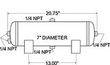 This Firestone air tank provides a source of compressed air for an air spring system. Tank has 3-gallon capacity, (3) 1/4 in. NPT ports and (1) 1/8 port. Tank is enamel coated, tested to be SAE J10 compliant and capable of 150 psi. Features: Provides compressed air source for an air helper spring system Allows for faster inflation of air springs Holds 3 gallons of compressed air Includes (3) 1/4 in. and (1) 1/8 in. NPT ports Steel tank with brass fittings Resists corrosion with internal and external enamel coating Is SAE J10 compliant Operates at up to 150 psi of maximum pressure Specs: Tank dimensions: 20.75 in. long x 7 in. diameter Tank capacity: 3 gallons Inflation ports: 1/4 in. and 1/8 in. NPT PSI: Maximum of 150 2-Year limited warranty
